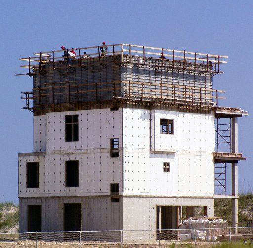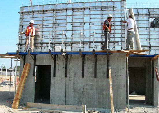 The scaffolding not only supports the weight of the workers but also supports the exterior wall forms.