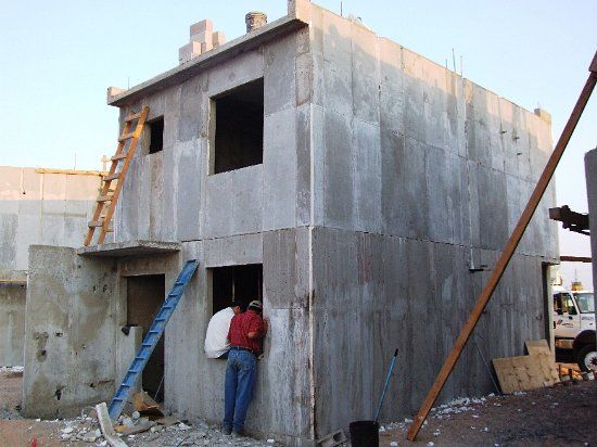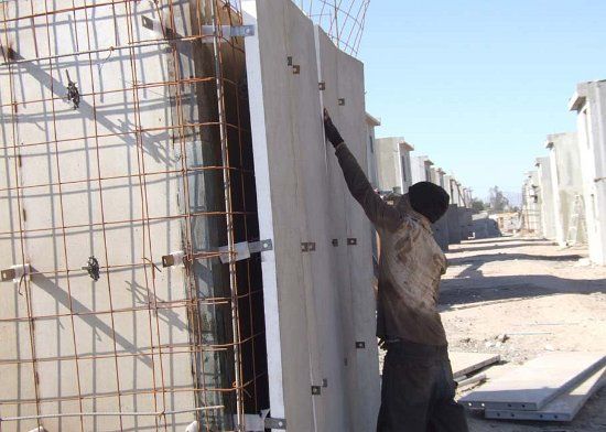 After concrete placement and curing, aluminum formwork is removed leaving foam insulation permanently bonded to the concrete.